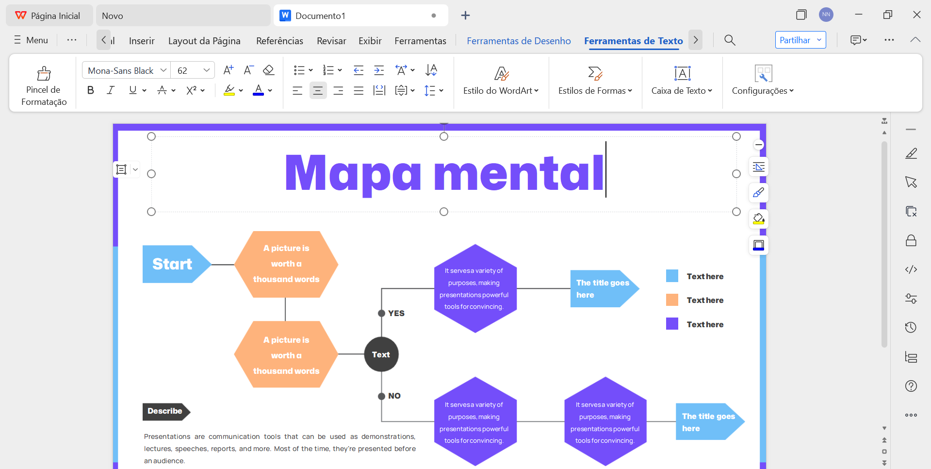 Depois que você escolher o seu modelo preferido de mapa mental, poderá editá-lo gratuitamente com o WPS Office. Eu já utilizei outras plataformas para edição, mas não são tão boas quanto essa. As ferramentas do Google são mais difíceis de usar e as ferramentas da Microsoft são muito caras, então eu sempre faço meus mapas neste programa gratuito.