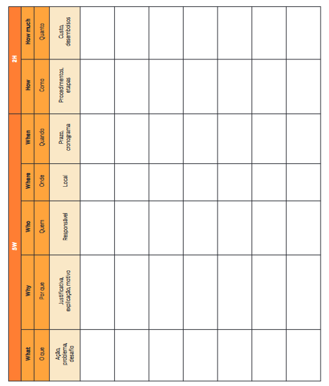 5W2H no plano de ação são as 7 perguntas cruciais para a elaboração de um plano. O nome vem das iniciais em inglês das palavras. São elas: o quê, por quê, quem, quando, onde, como e quanto.