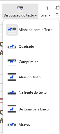 Para facilitar, clique em “Disposição do Texto”, em cima, então em “Atrás do Texto”, permitindo que você insira a imagem onde você quiser. Agora, para redimensionar a imagem, é só arrastar as âncoras em seus cantos, enquanto você pode movê-la clicando e arrastando com o mouse.