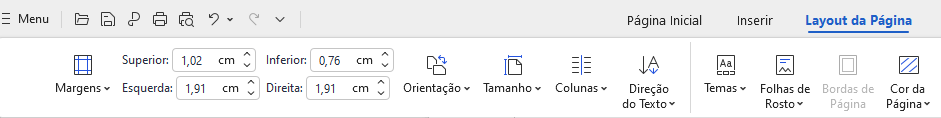 Agora, você pode fazer essas configurações em “Layout da Página”, no menu superior, escolhendo o tamanho do papel e as margens.
