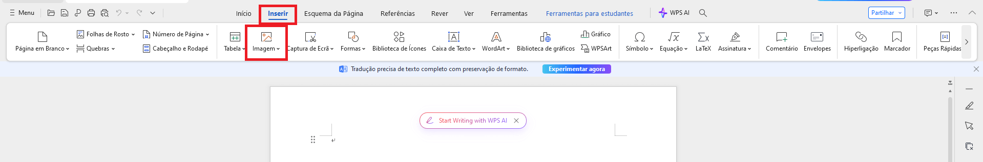 Passo 1: Abra o WPS Writer e insira a imagem que você deseja editar clicando em "Inserir" e depois em "Imagem".