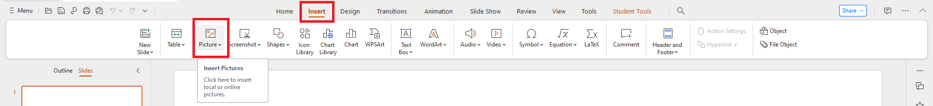 Passo 1: Abra o WPS Presentation. Depois clique em "Inserir" - "Imagem".